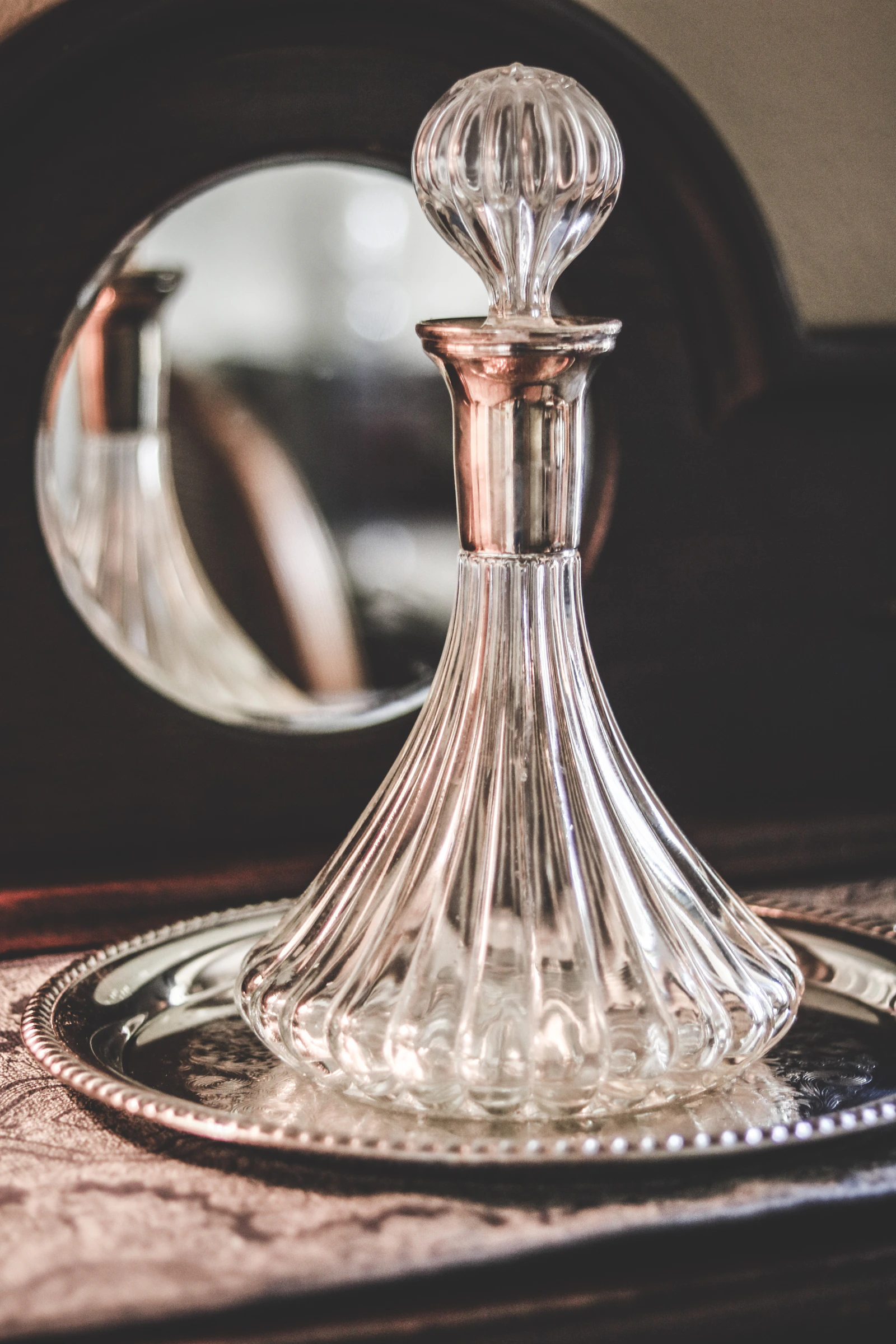 Хрустальный декантер на серебряном подносе, старое зеркало в тёплой полутени — вечерний ритуал.